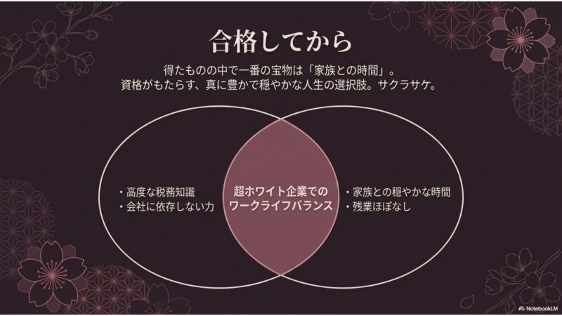私は、法人税法に合格した時点で、超ホワイト企業の経理に転職しました。今は、結婚もして、子どもにも恵まれて穏やかな生活を送っています。