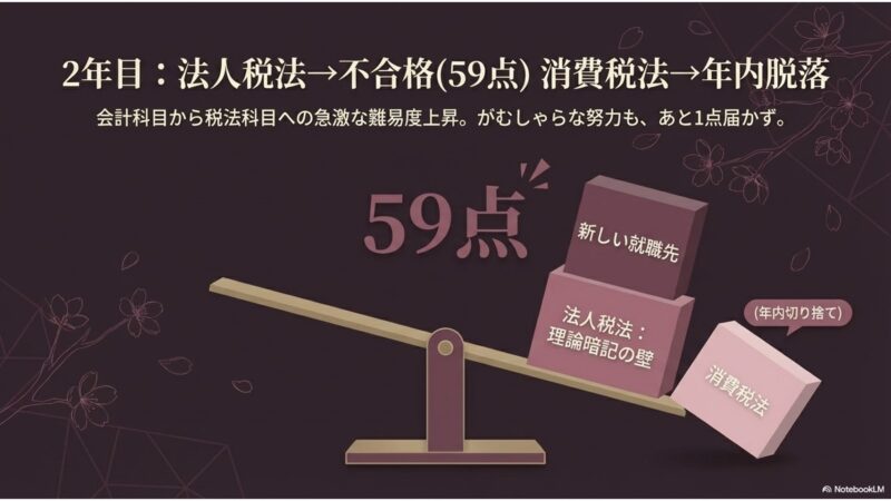 2年目:法人税法→不合格(59点) 消費税法→年内脱落