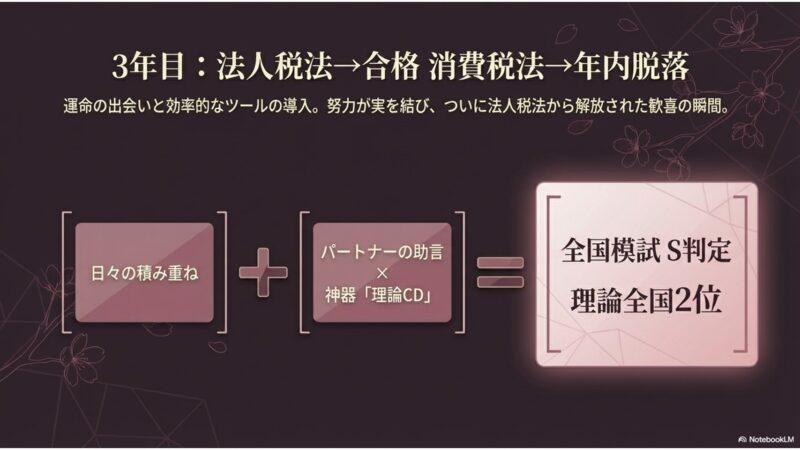 もともと法人税法の計算問題が好きであったが、理論暗記も順調に勉強できたので、TACの全国模試では「S判定」。