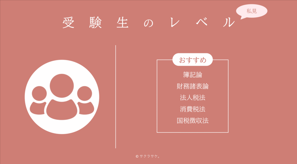 | 受験生レベル低め | 簿・財・法・消・国 |