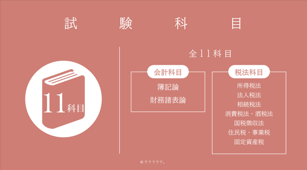 税理士試験の試験科目は全11科目あり、会計科目2科目と税法科目9科目で構成されています。