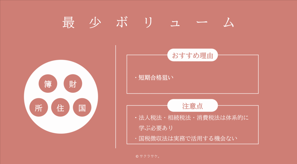 会計科目と同時受験する場合の税法科目は勉強のボリュームが比較的少ないミニ税法をおすすめします。