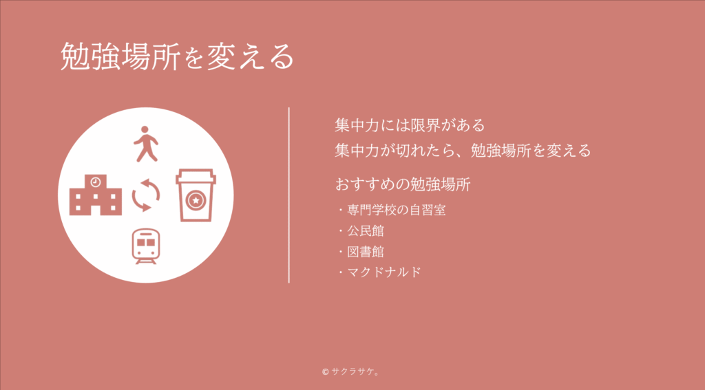 集中力が切れてしまったときは、勉強場所を変えて勉強時間を確保することをおすすめします。