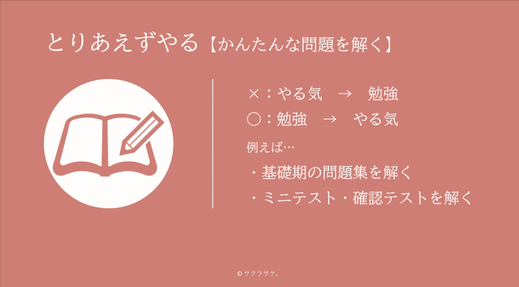 【かんたんな問題を解く】ことでやる気が起きるので、その後、答練や理論暗記などに取り組みましょう。