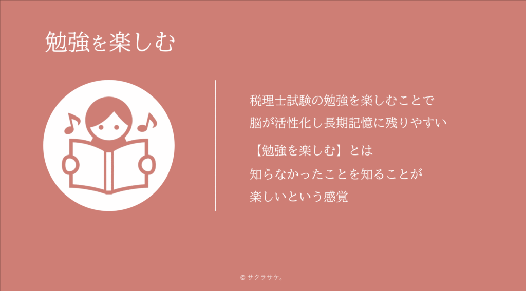 学生時代に勉強が嫌いだった人も多いので、【勉強=楽しくない】という認識が刷り込まれている方が多いかと思いますが、税理士試験の勉強を楽しむことで、脳が活性化し長期記憶に残りやすくなります。