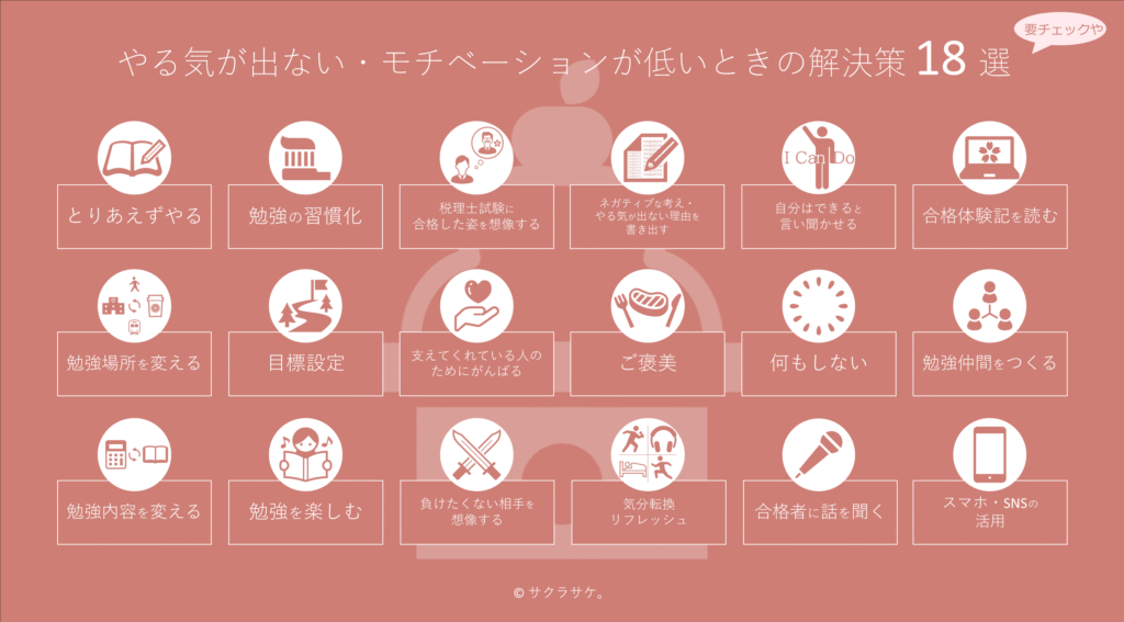 勉強するやる気が出ない・モチベーションが低いときの解決策を5年間税理士試験に挑戦した私が18選お伝えします。