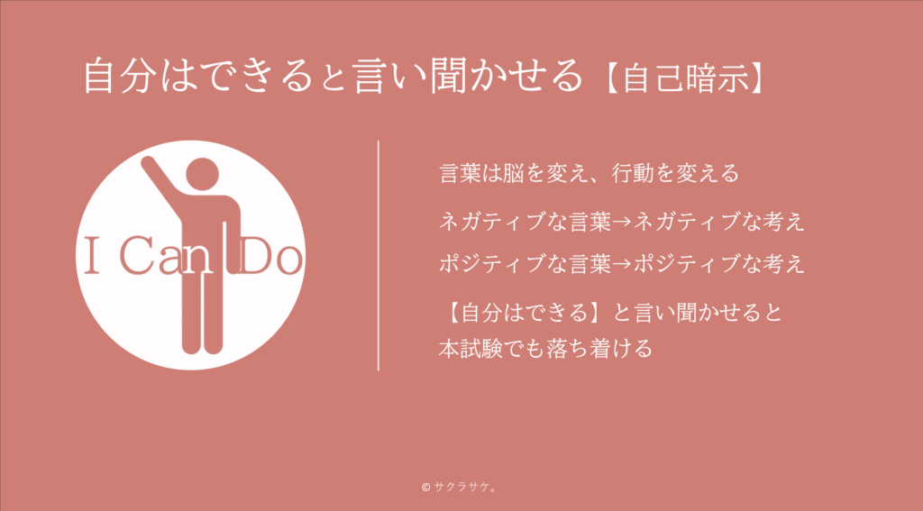 本試験でも同様に「大丈夫、自分ならできる」と言い聞かせることで落ち着いて試験を受けることができました。